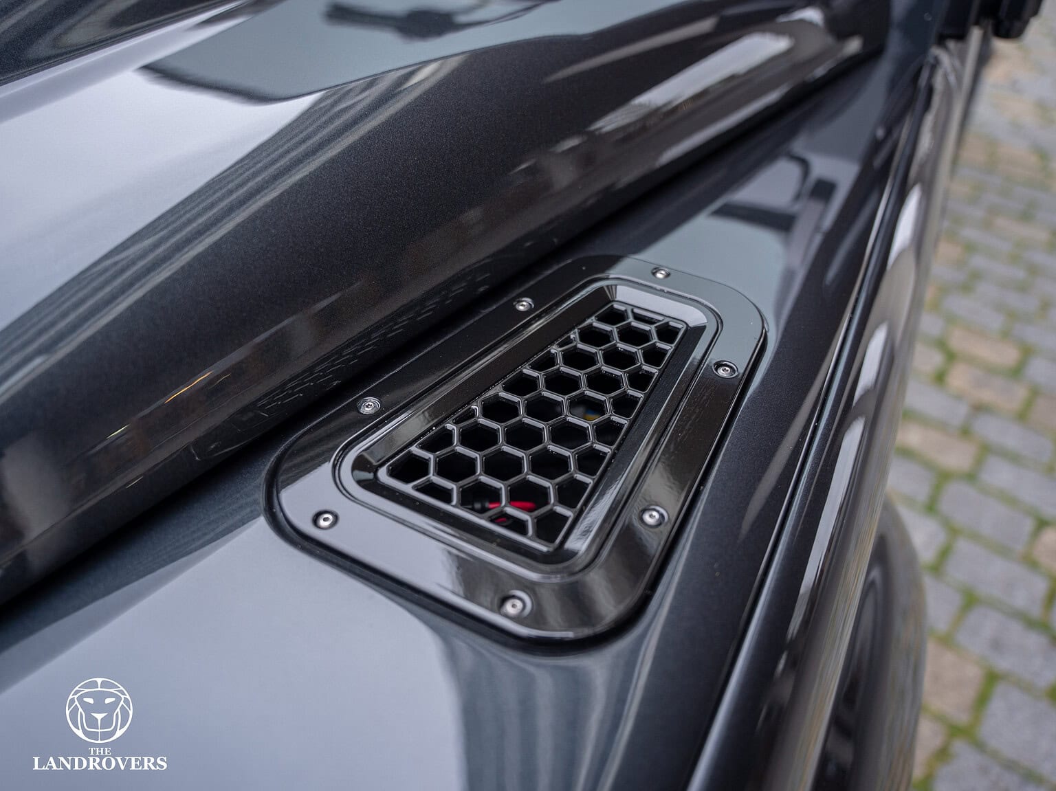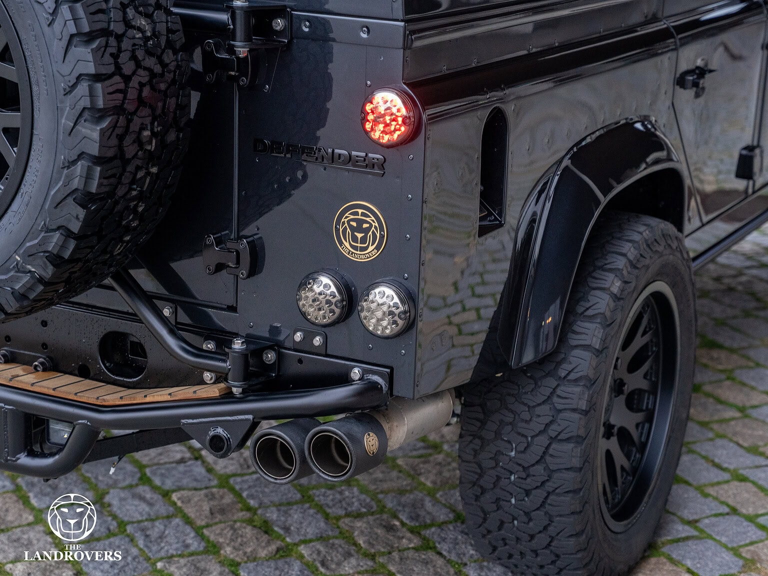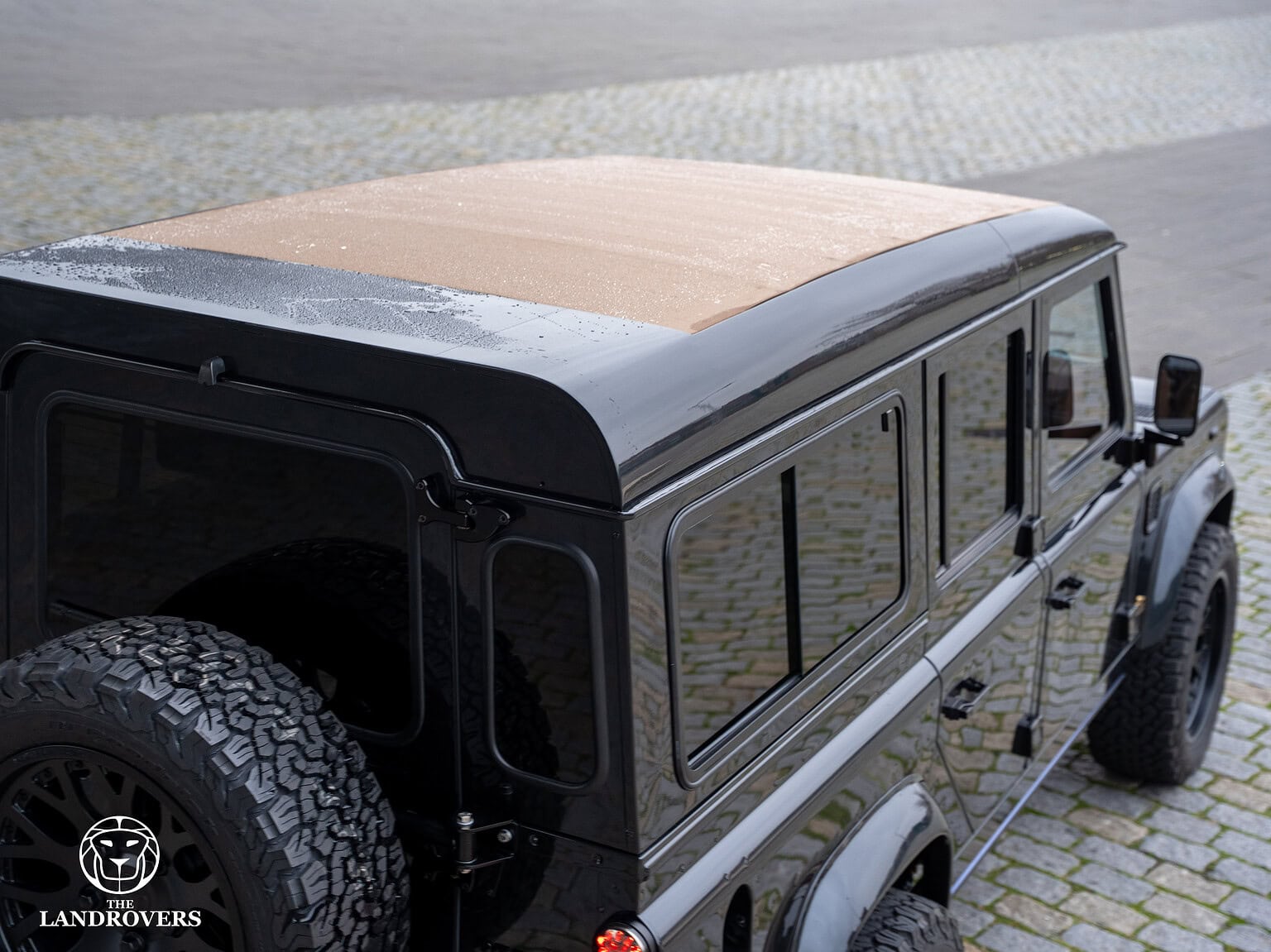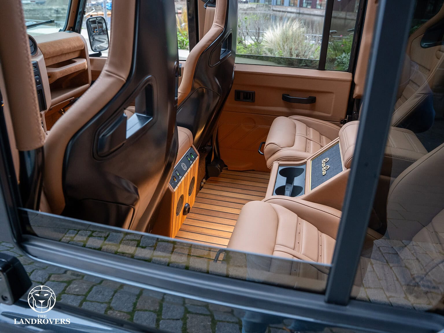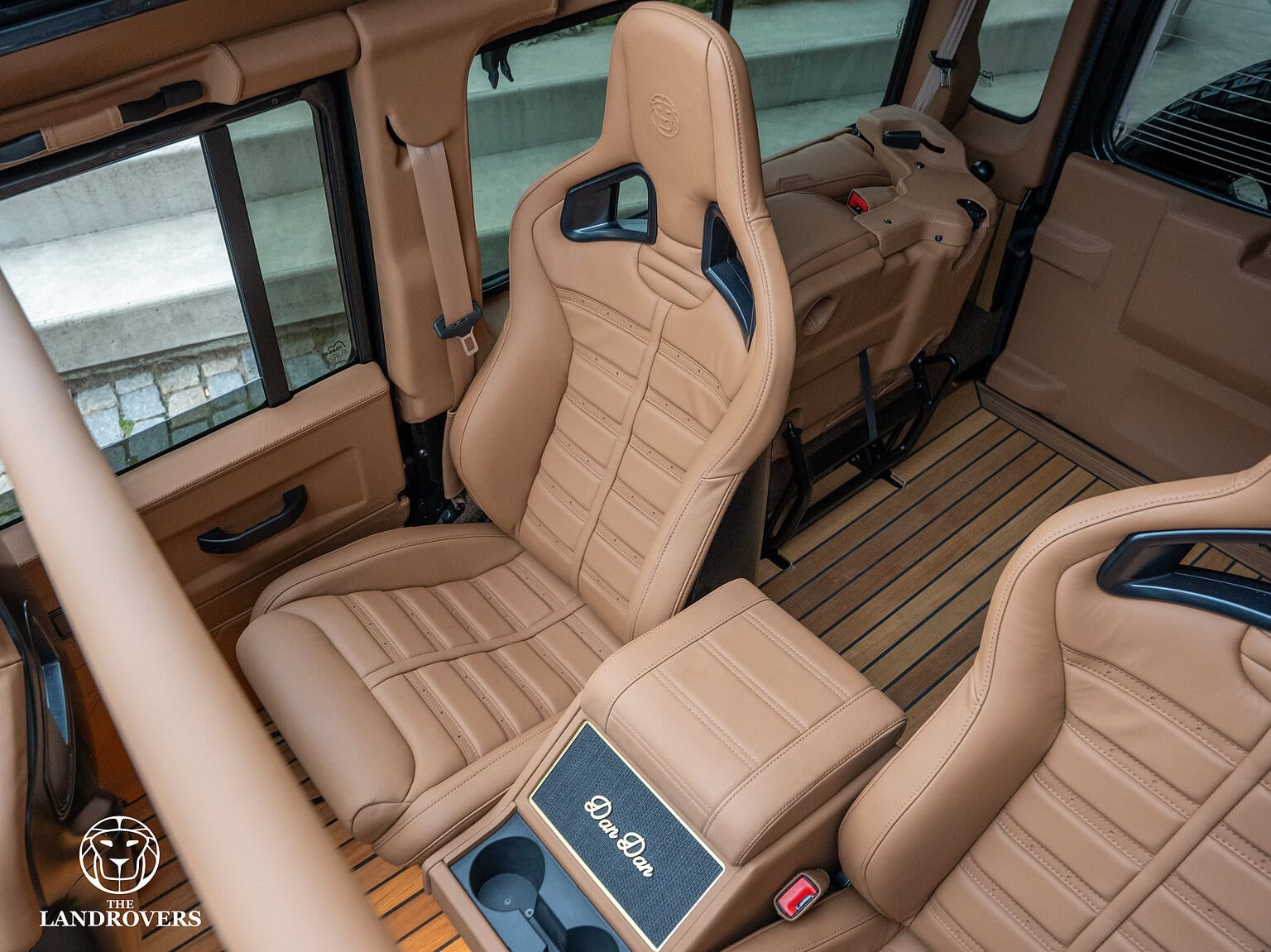Dan Dan is finished in designo nachtschwarz magno, combined with a our sand beige automatic sliding roof, 20-inch Panterra Tiger wheels, backed by a Corvette LT1 engine with a 10-speed gearbox. A quad pipe exhaust system, with a valve control on the dashboard. Inside, full focus on materials and craftsmanship. Havana brown leather runs throughout, including a full leather headliner. Want to learn more about upholstered Recaro seats in Daytona stitch with and the digital HMI cluster? Discover the full story: Dan Dan Defender in Dubai – From Workshop to Skyline.